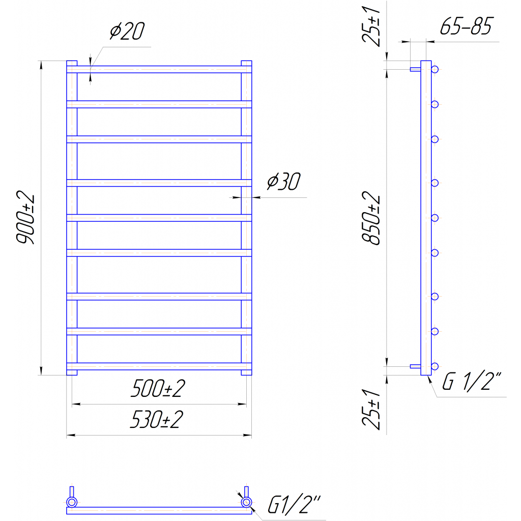 Розміри: висота - 900 мм, ширина - 530 мм, глибина 100 мм, міжцентрова відстань для підключення - 500 мм, діаметр підключення G1/2''.