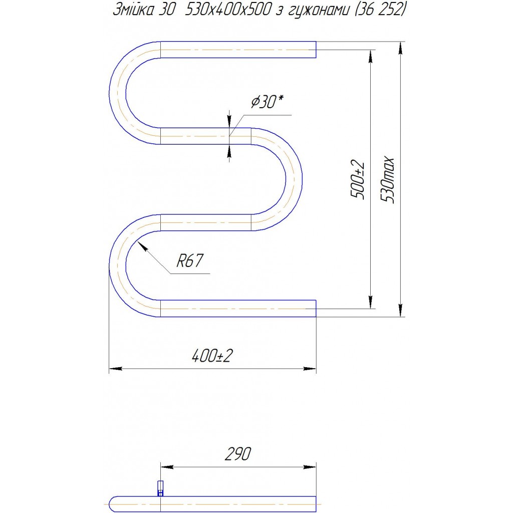 Водяна рушникосушарка Змійка ∅30 530х400 з міжцентровою відстанню для підключення 500мм, діаметр підключення G 1/2' 3 згина. Рушникосушарка Змійка 30 з боковим підключенням виробляється на нашому підприємстві Маріо з 1998 року.